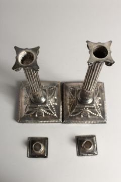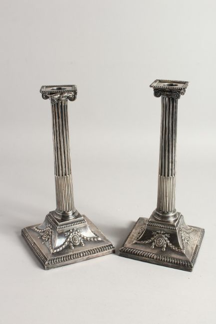 A GOOD PAIR OF GEORGE III SILVER CLASSICAL CANDLESTICKS with Corinthian columns, square loaded bases with garlands.