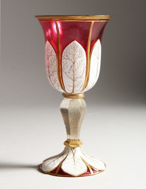 A BOHEMIAN RUBY, WHITE OVERLAY GOBLET with gilt decoration.