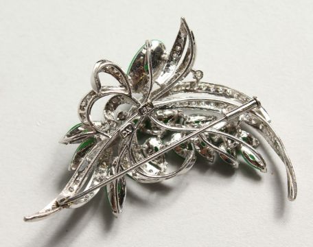 A SUPERB DIAMOND AND JADE FLORAL BROOCH set in18ct white gold