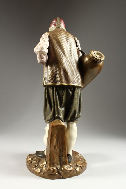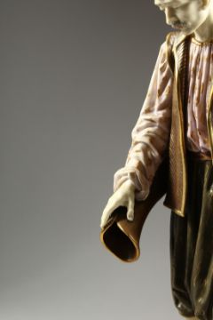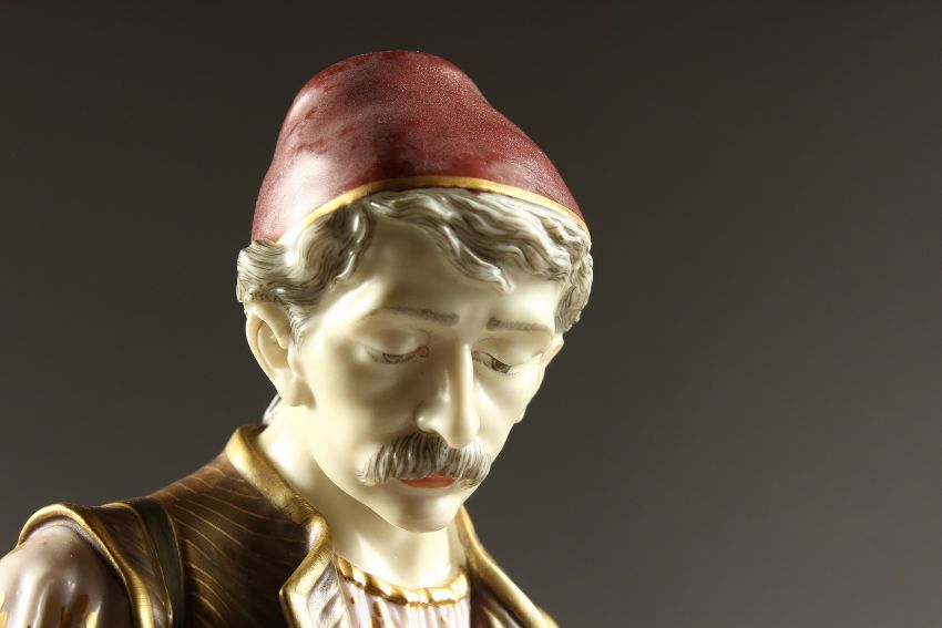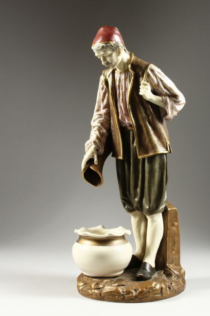A ROYAL WORCESTER PORCELAIN FIGURE OF A TURK by Hadley, standing, pouring from a jug, into a bowl.