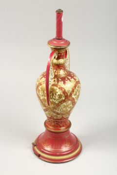 A HUNGARIAN POTTERY TWO HANDLE LAMP on a circular base.