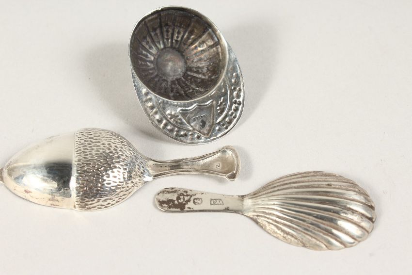 TWO SILVER CADDY SPOONS, JOCKEY CAP AND ACORN