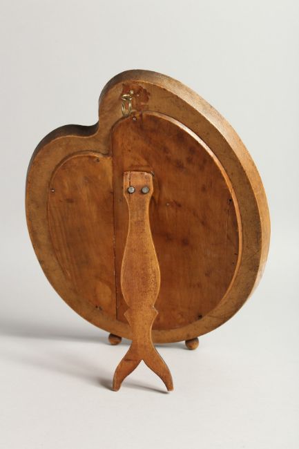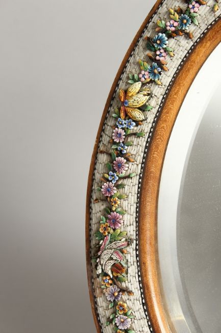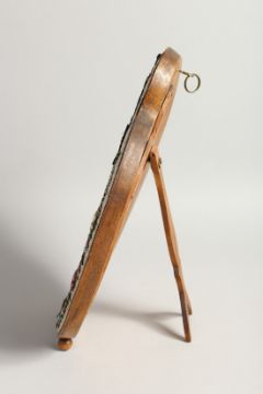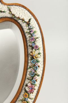 A GOOD MOSIAC FRAMED SHAPED EASEL MIRROR with a band of flowers