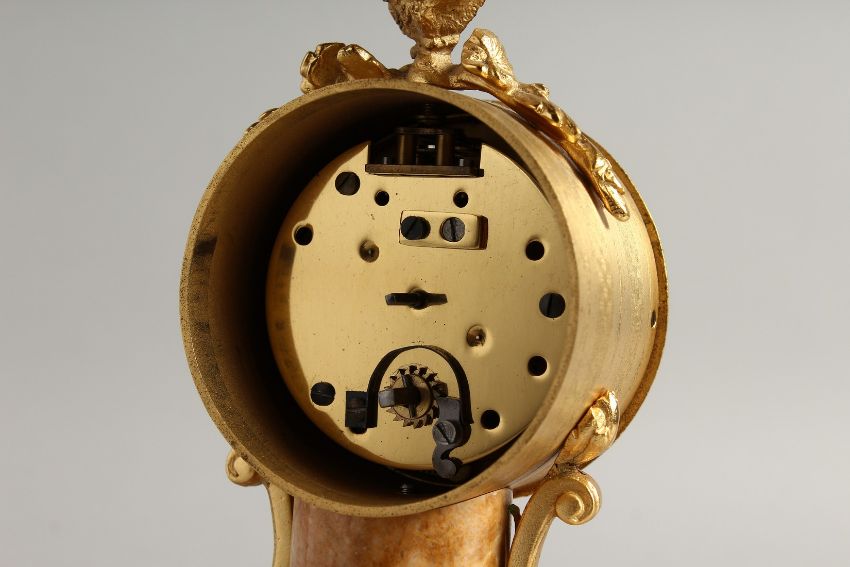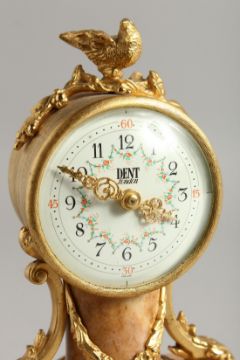 A GOOD SMALL FRENCH LOUIS XVITH STYLE ORMOLU MARBLE DRUM CLOCK, retailed by Dent, London.