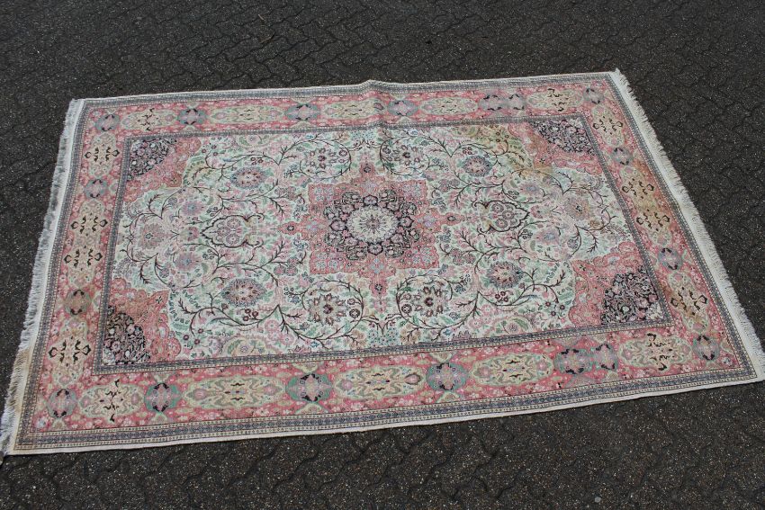 A MID 20TH CENTURY PERSIAN SILK KASHMIR CARPET, pale cream ground with typical floral decoration.