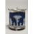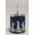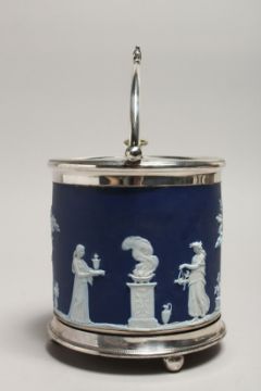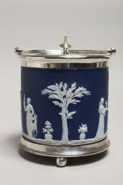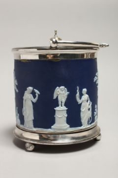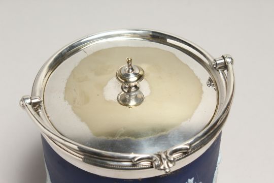 A GOOD WEDGWOOD BLUE AND WHITE JASPER WARE BISCUIT BARREL AND LID.