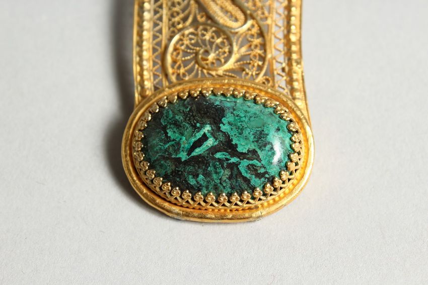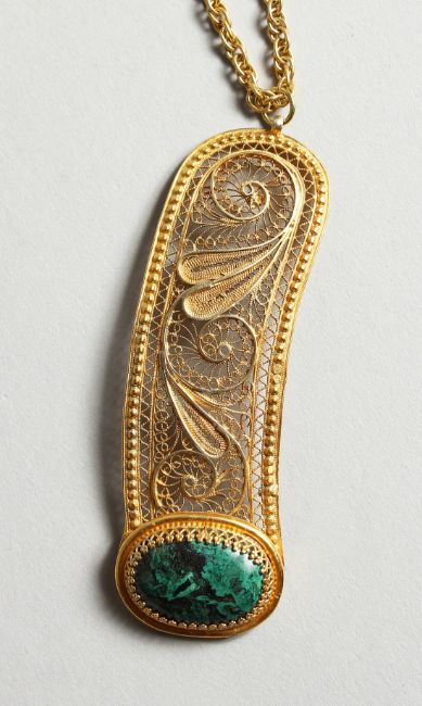 A FILEGREE AND GREEN STONE PENDANT AND CHAIN