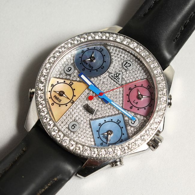 A VERY GOOD DIAMOND SET JACOB AND CO. WRISTWATCH with leather strap.