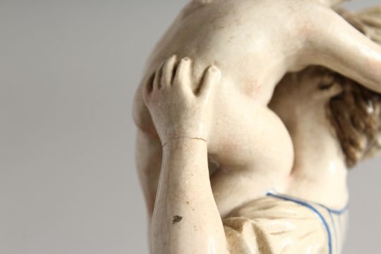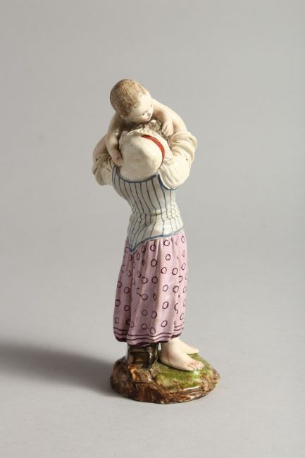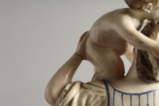 A 19TH CENTURY HORCH POTTERY GROUP, MOTHER AND CHILD, on a rustic base.