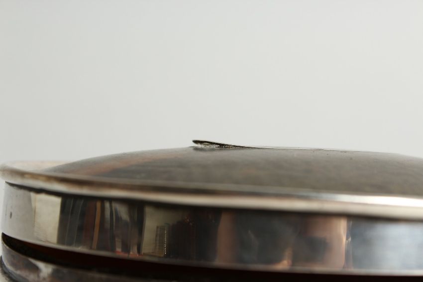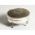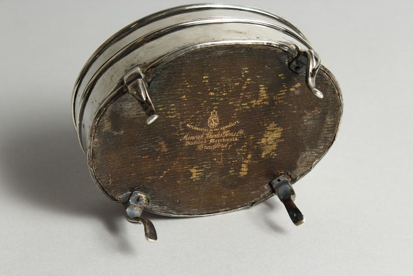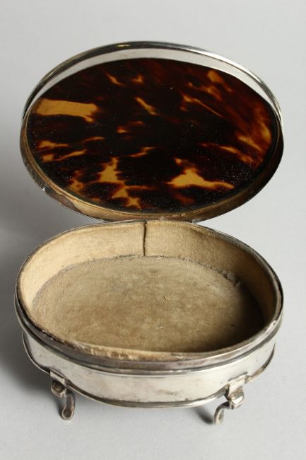 A GEORGE V SILVER AND TORTOISESHELL OVAL PIN BOX on four curving legs.
