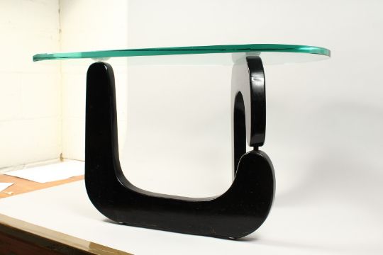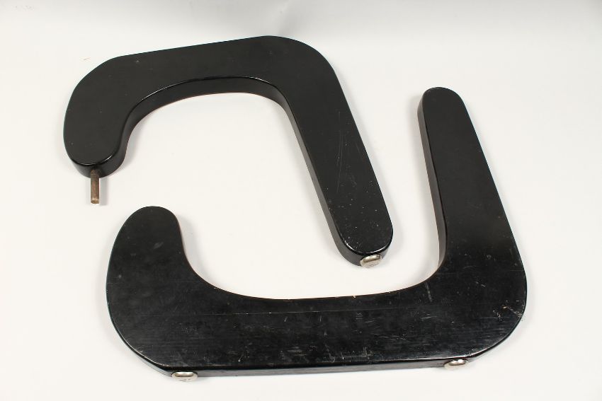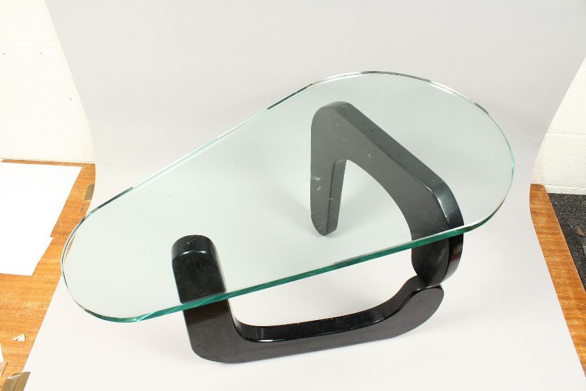 AN UNUSUAL MID 20TH CENTURY 'BOOMERANG' TABLE with plate glass top and ebonised supports