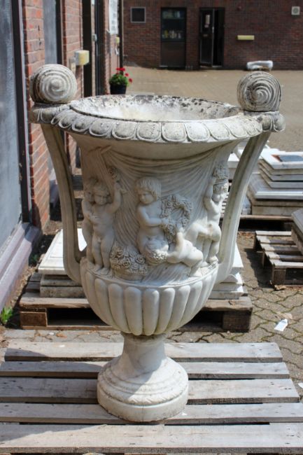 A VERY GOOD, PAIR OF ITALIAN CARVED, WHITE MARBLE TWO HANDLED URNS, the sides carved with cupids
