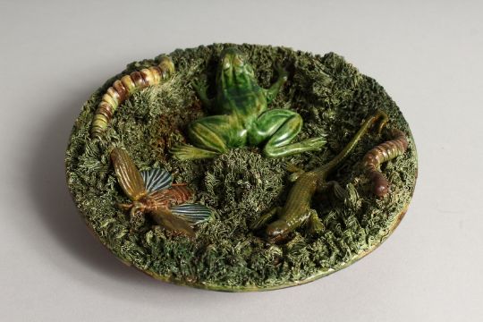A PALISSY WARE TYPE CIRCULAR DISH, moulded decoration with a frog, lizard etc., impressed mark to the base