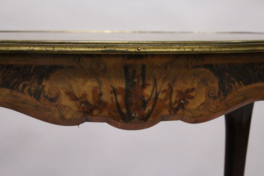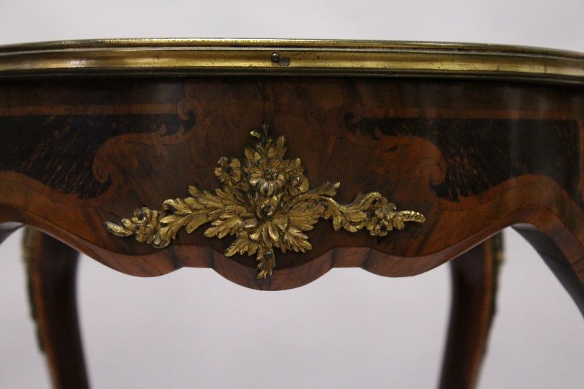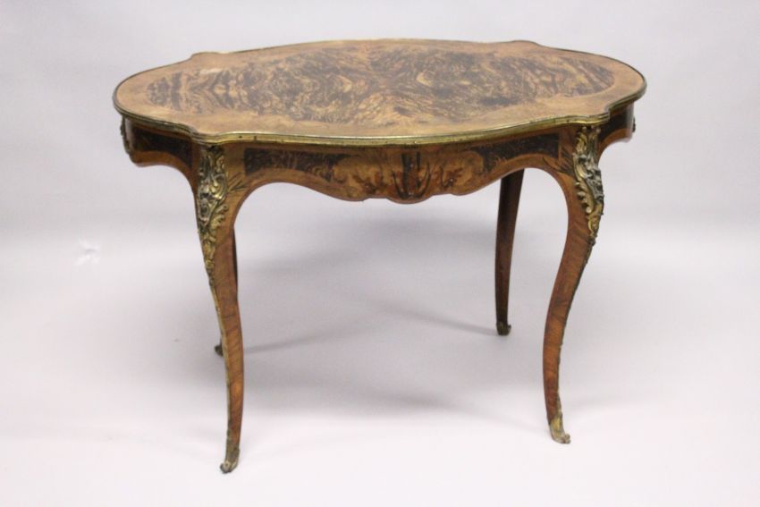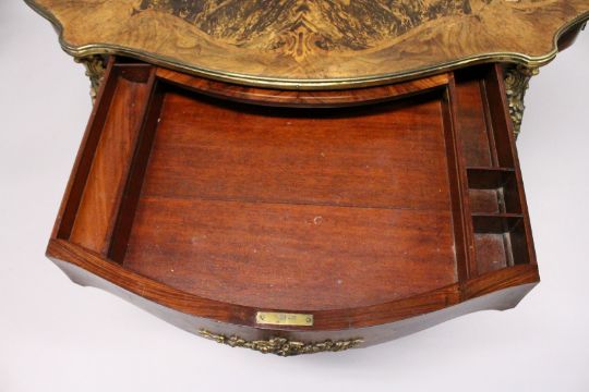 A 19TH CENTURY WALNUT, KINGWOOD AND ORMOLU MOUNTED CENTRE TABLE, with a quarter veneered and inlaid top above a single drawer fitted with a writing surface and compartments for pens and inkwells, on cabriole legs.