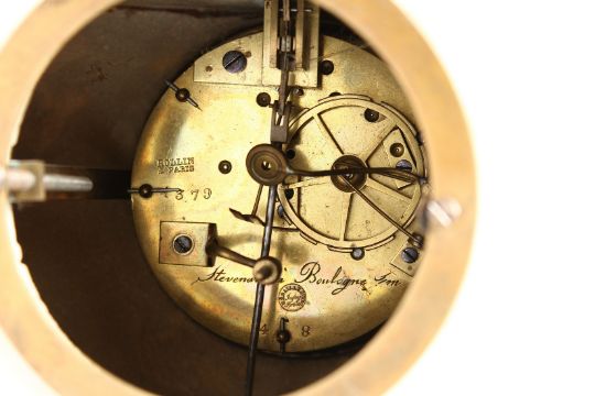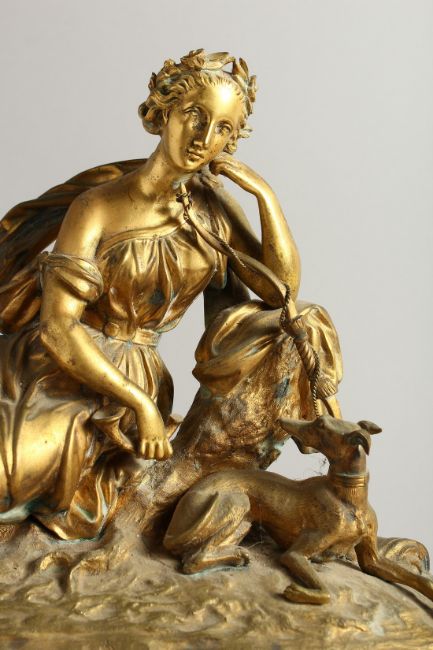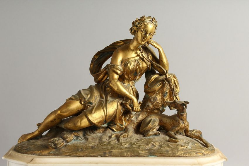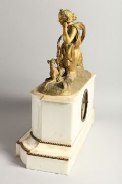 A 19TH CENTURY FRENCH ORMOLU AND WHITE MARBLE CLOCK by Stenward, Boulonge.. The top with classical figures and dog.