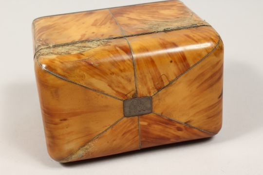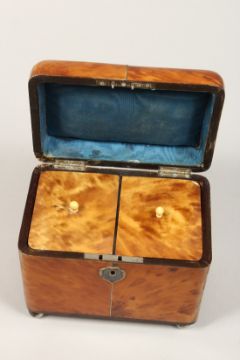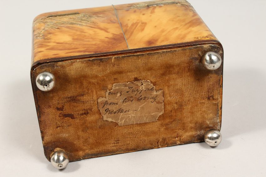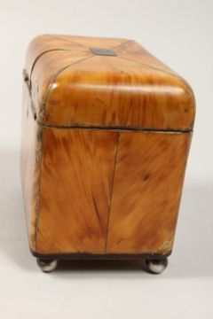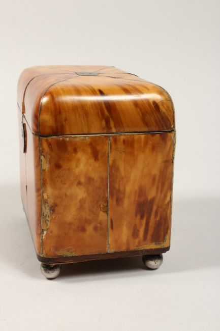A GOOD REGENCY TORTOISESHELL TWO DIVISION TEA CADDY with segmented top on silver ball feet.