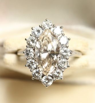 A SUPERB 18CT GOLD CHAMPAGNE DIAMOND SURROUNDED BY TWELVE WHITE DIAMONDS.