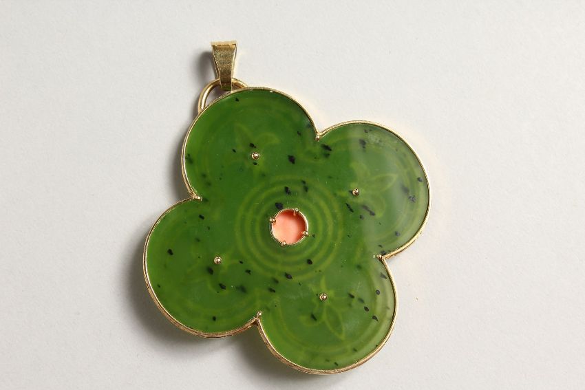 A SUPERB 18 CT GOLD JADEITE AND CORAL PENDANT