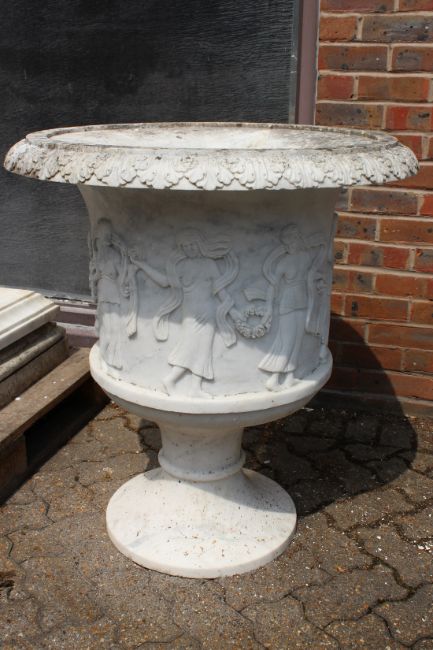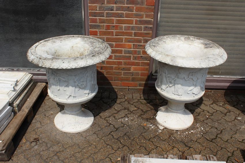 A VERY GOOD PAIR OF ITALIAN CARVED WHITE MARBLE TWO HANDLED URNS, the sides carved with figures dancing. 2ft 6ins high