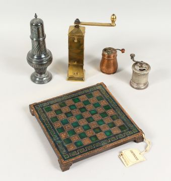 A BRASS SPICE GRINDER, A SUGAR SIFTER, A GREEK CHESS BOARD and two small grinders (5).