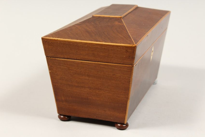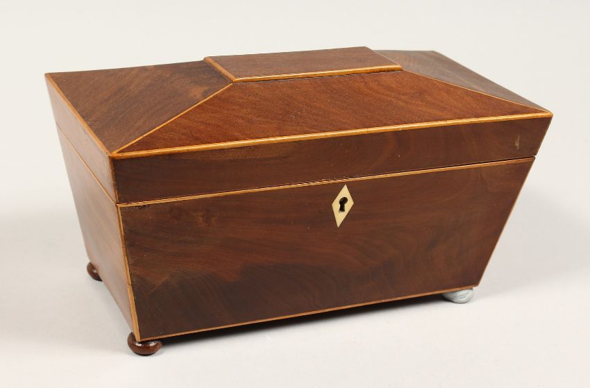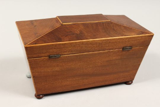 A REGENCY MAHOGANY TWO DIVISION TEA CADDY, satinwood banding on bun feet.
