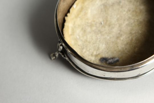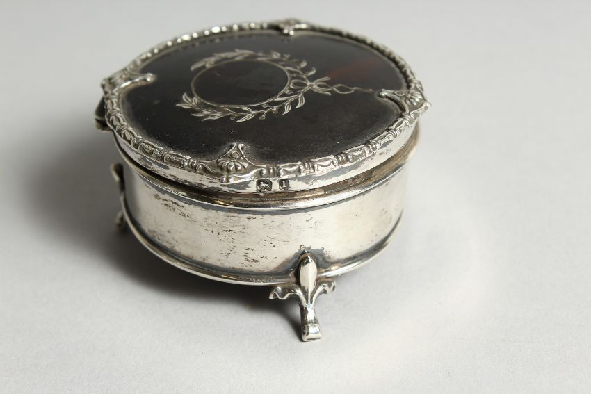 A GEORGE V SILVER AND TORTOISESHELL CIRCULAR PIN BOX, on three legs.