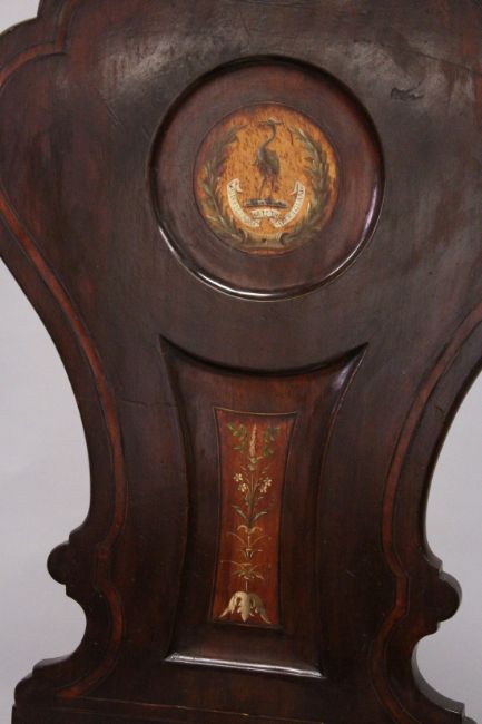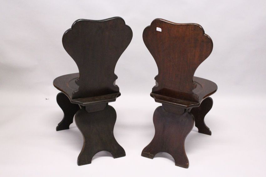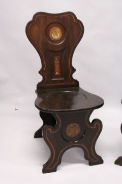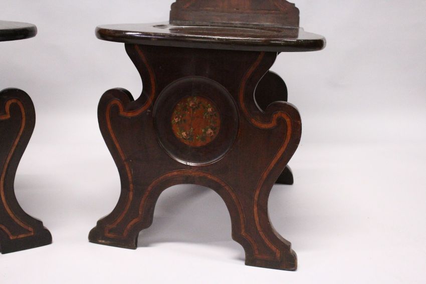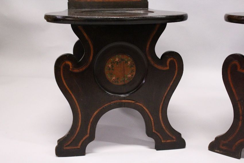 A GOOD PAIR OF REGENCY MAHOGANY HALL CHAIRS with shaped backs with painted crest, solid seats front legs with inlay and painted panel.