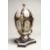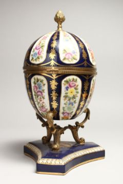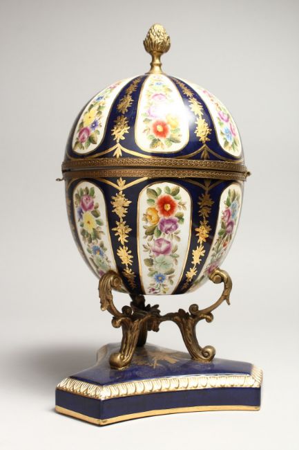 A LARGE SEVRE STYLE BLUE AND GILT EGG SHAPED CASKET AND COVER, painted with flowers on a triangular base.