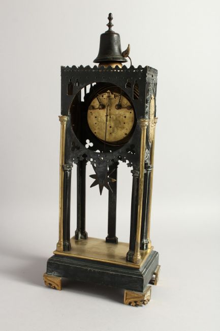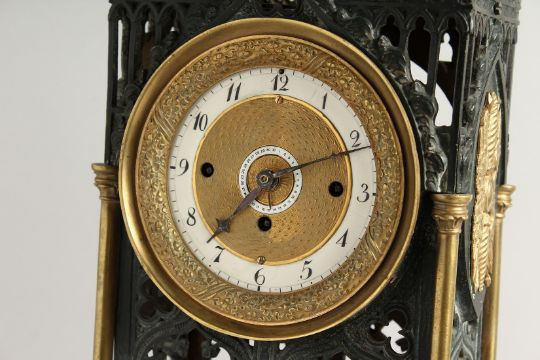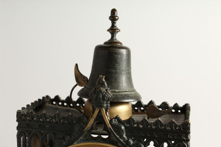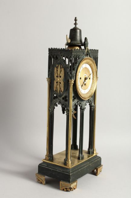 A GOOD GOTHIC DESIGN BRONZE AND ORMOLU CLOCK, the dial with 2 rings 1 - 12 & 1 - 31.