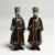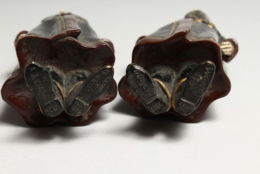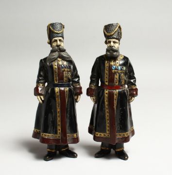 A PAIR OF RUSSIAN BRONZE FIGURES of two men in costume and wearing medals