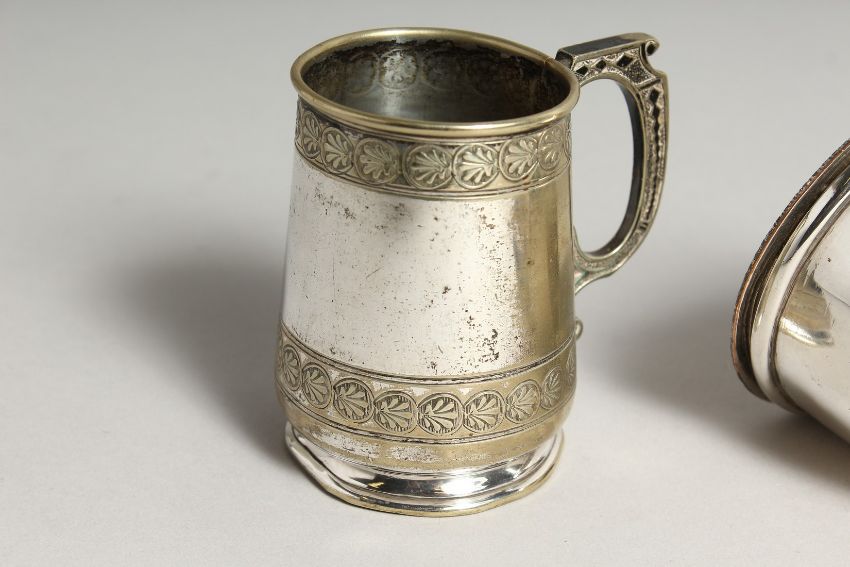 A SHEFFIELD PLATE WINE FUNNEL and a christening mug (2)