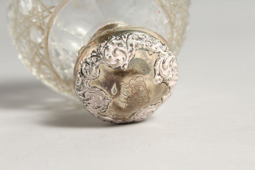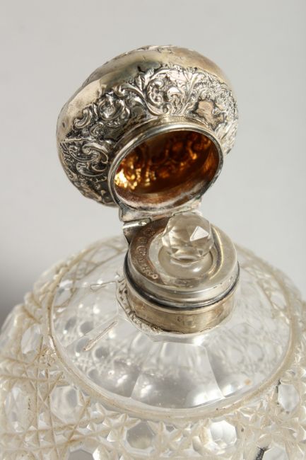 A VICTORIAN CUT GLASS SCENT BOTTLE with silver top.