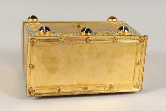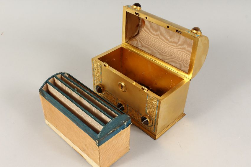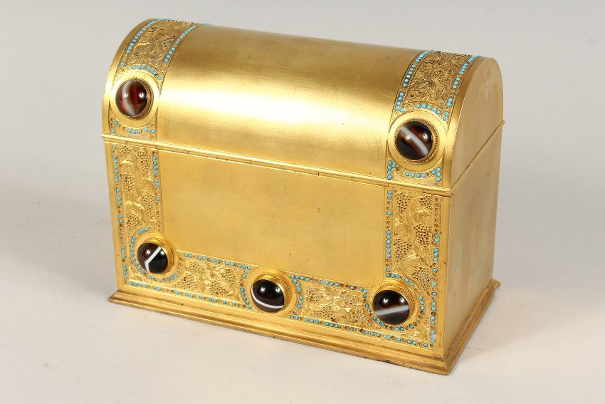 A GOOD 19TH CENTURY FRENCH BRASS DOMED SHAPED CASKET, inset with agate pieces opening to reveal a leather fitted interior.