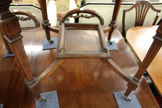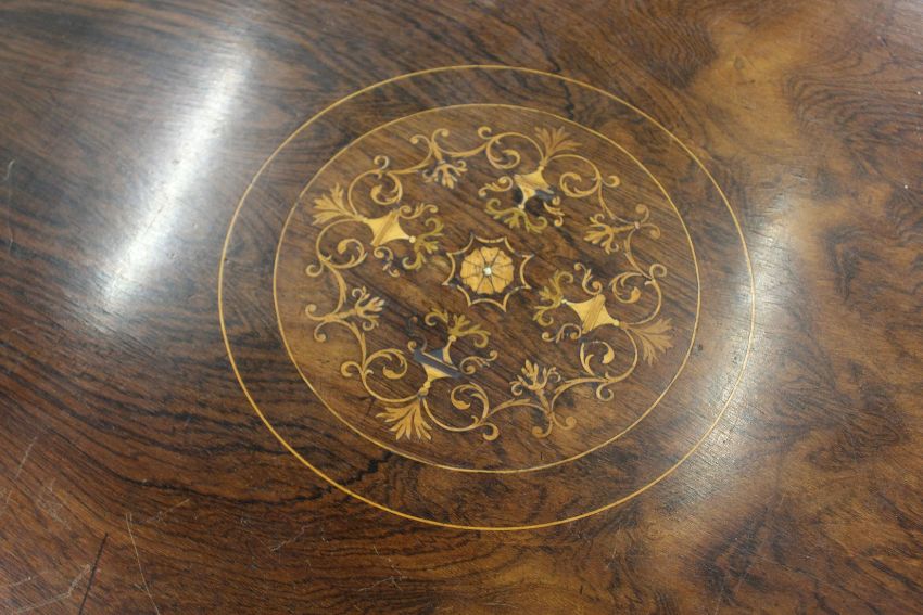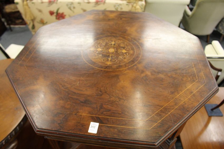 AN EDWARDIAN INLAID ROSEWOOOD OCTAGONAL TOP CENTRE TABLE with tapering legs and porcelain castors.