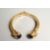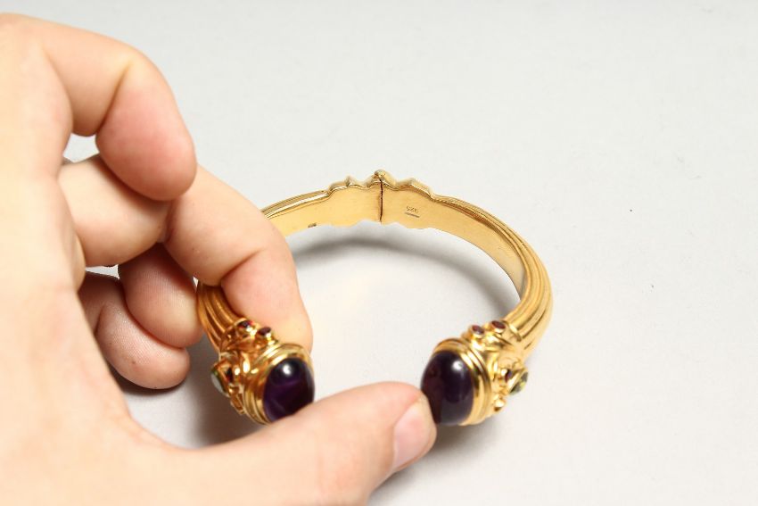 A GOOD TORQUE STYLE SPRING GILDED SILVER BANGLE, set with a pair of cabochon amethysts, two pear shaped peridots and twelve small garnets.