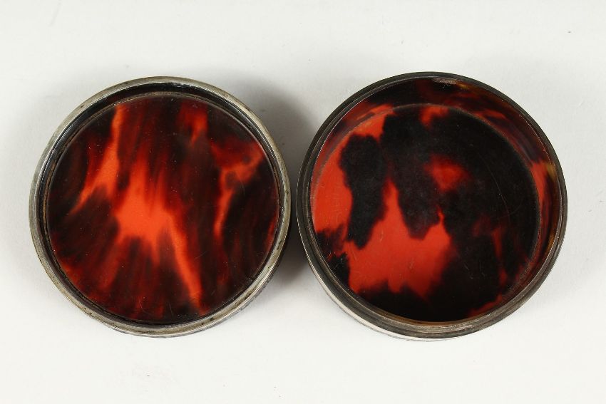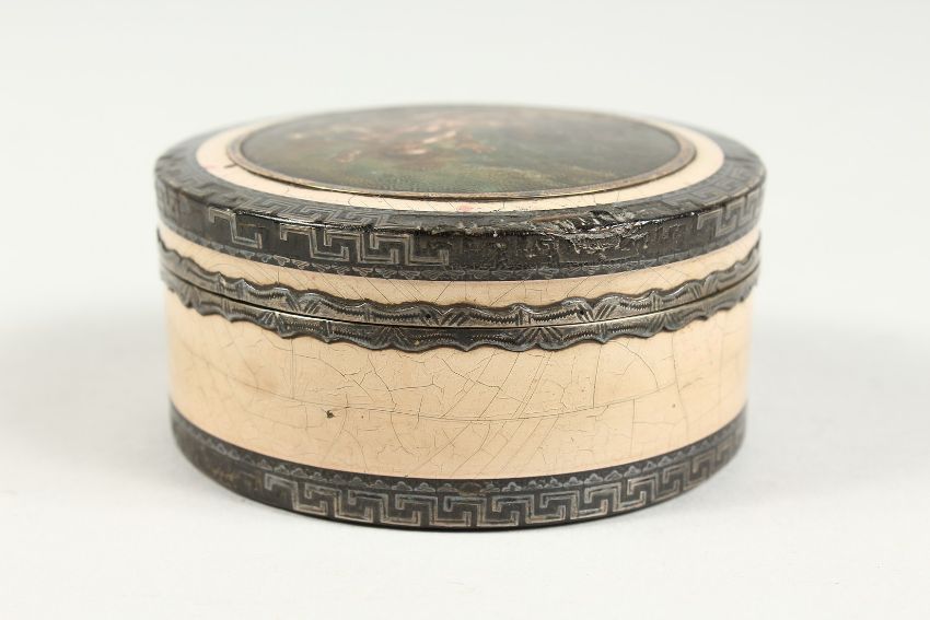 A GEORGIAN TORTOISESHELL CIRCULAR BOX with key pattern silver banding, the top painted with cupids.