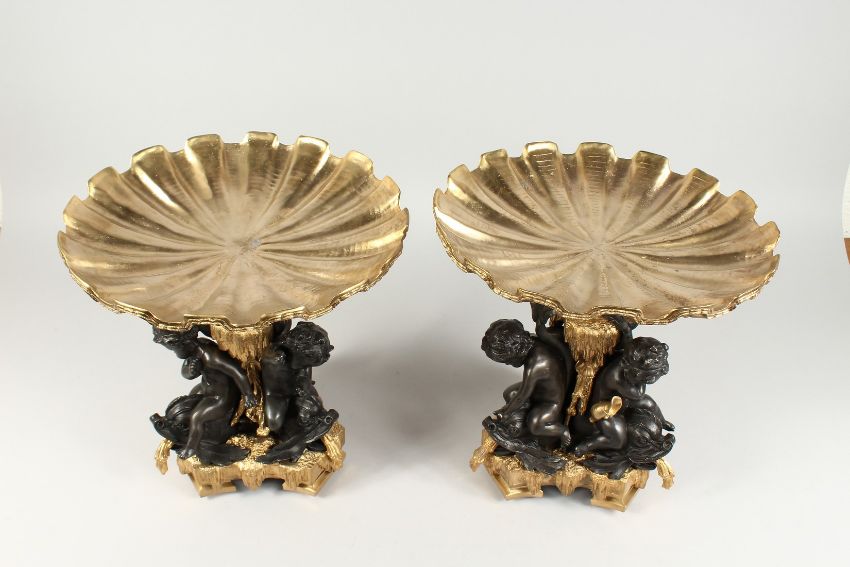 A GOOD PAIR OF BRONZE AND GILT BRONZE COMPORTS with shell shaped tops, three cupid supports.