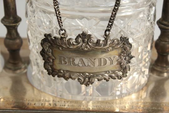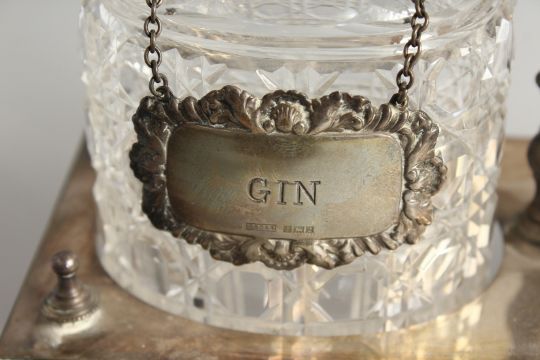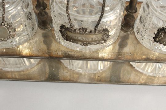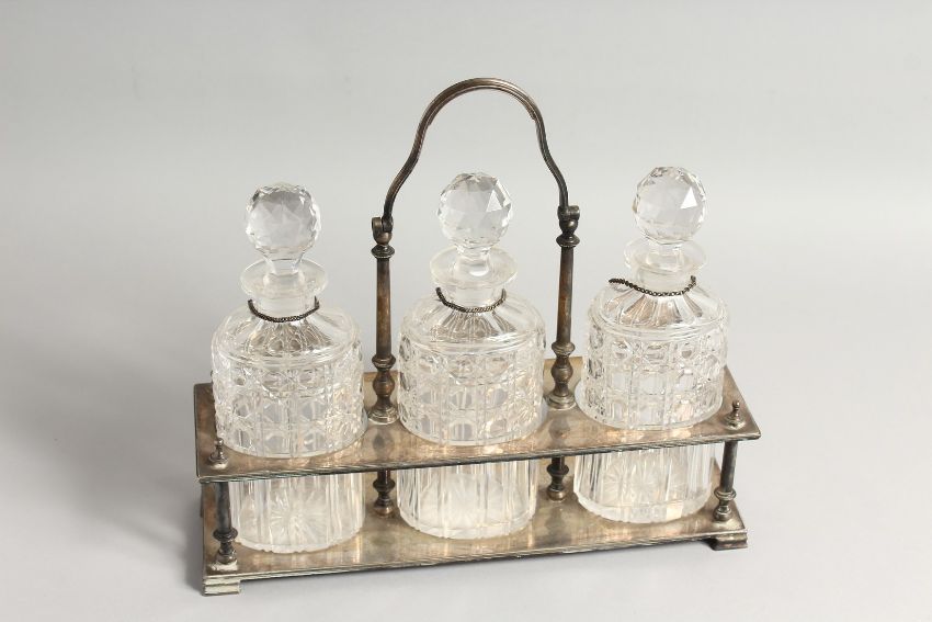 A VERY GOOD VICTORIAN, GILDED PLATE THREE BOTTLE DECANTER STAND, with oval bottles and stoppers, three labels, on bracket feet.