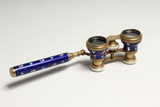 A VERY GOOD SET OF ENAMEL AND MOTHER OF PEARL OPERA GLASSES with handles. Comptoir Central, Bruxeles.