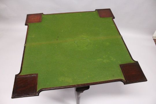 A GEORGE III MAHOGANY FOLD OVER CARD TABLE with a shaped rectangular top, green beize lining with counter wells/glass stands, cabriole legs with pad feet.