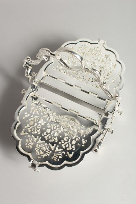 A SMALL PLATED, SHELL, FOLDING CHEESE AND BISCUIT STAND.