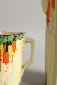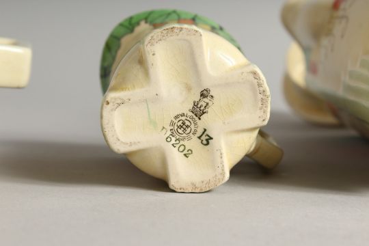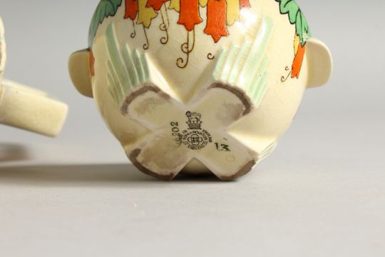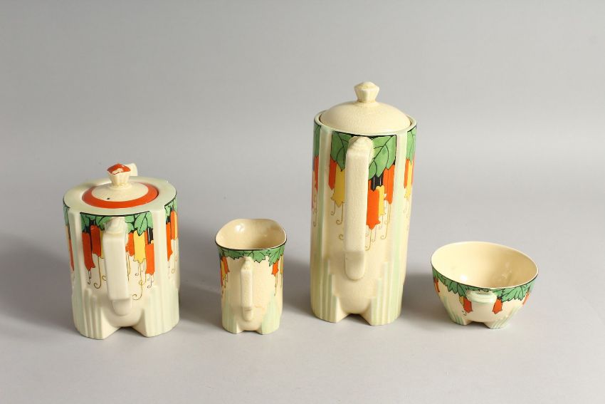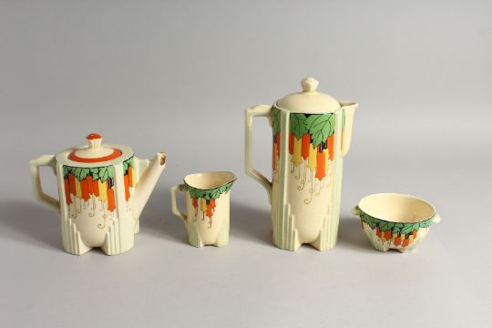 A ROYAL DOULTON ART DECO PART TEA SERVICE decorated in the manner of Clarice Cliff, comprising tea pot, hot water jug, cream jug and sugar bowl.