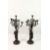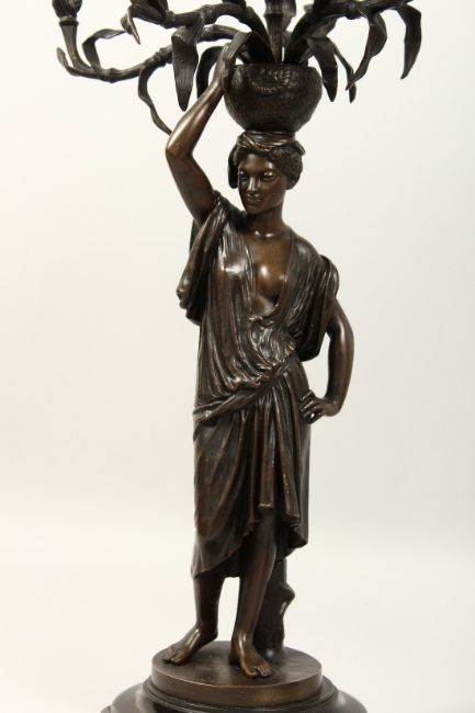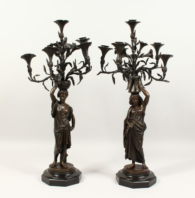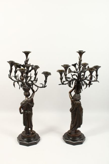A SUPERB PAIR OF BRONZE STANDING CLASSICAL FIGURES holding six scrolling branches.