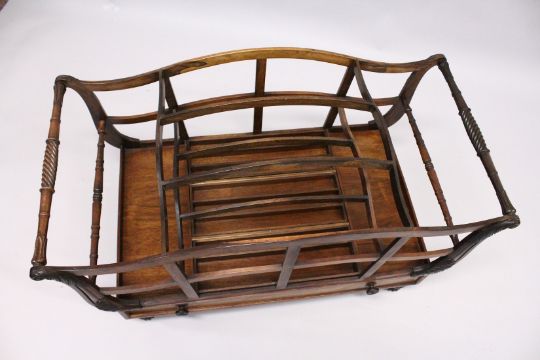 A VERY GOOD GILLOWS OF LANCASTER ROSEWOOD CANTERBURY with curving supports, the centre section with three divisions and three pull out trays. The base with one long drawer, stamped GILLOW LANCASTER and supported on fluted legs with inset brass casters.