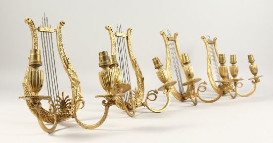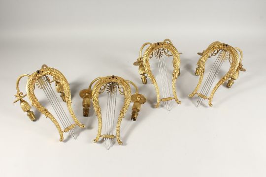 A VERY GOOD SET OF FOUR FRENCH ORMOLU, LYRE, TWO LIGHT WALL SCONCES with acanthus and anthemis.