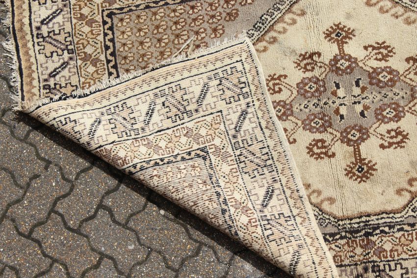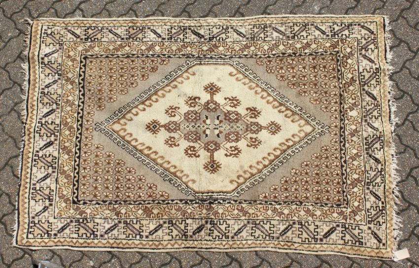 A PERSIAN RUG brown and cream with large medallions.