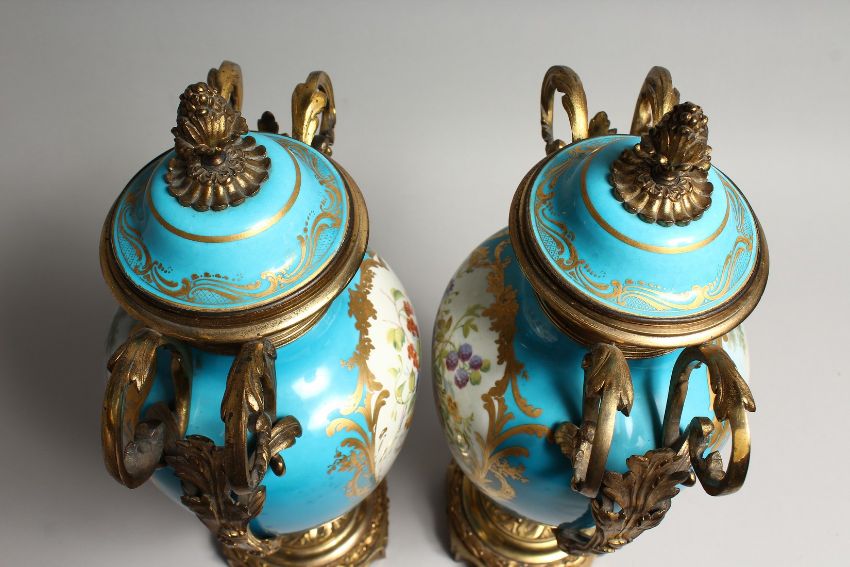 A SUPERB LARGE PAIR OF SEVRES PORCELAIN ORMULO MOUNTED CIRCULAR VASES AND COVERS, painted with reverse panels of flowers.