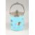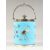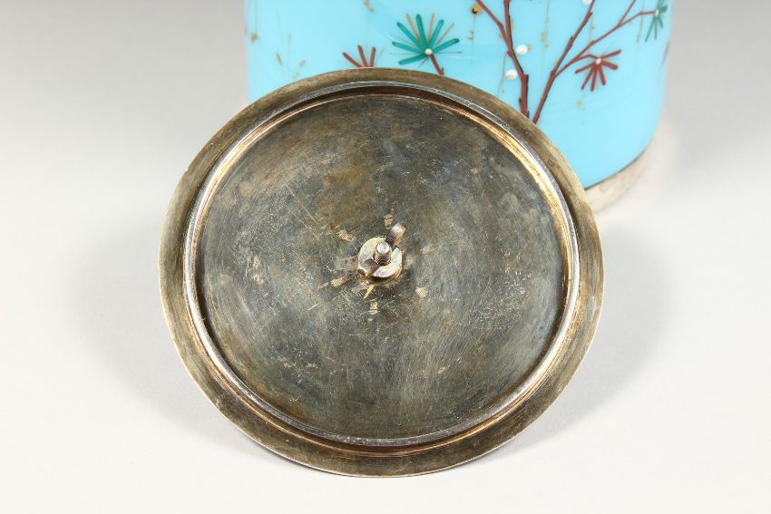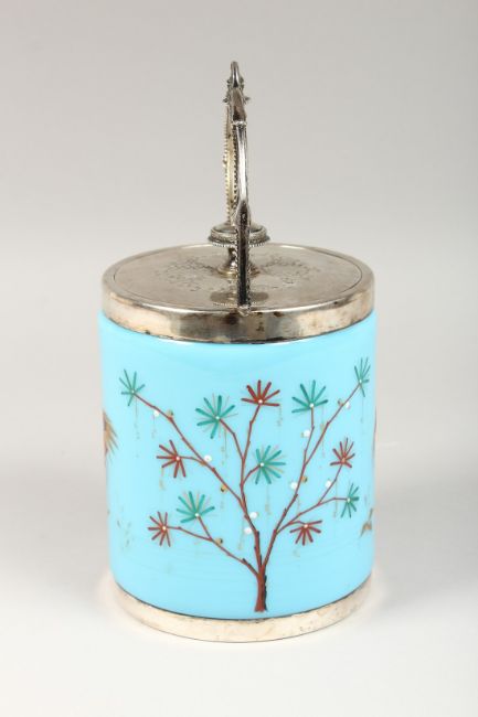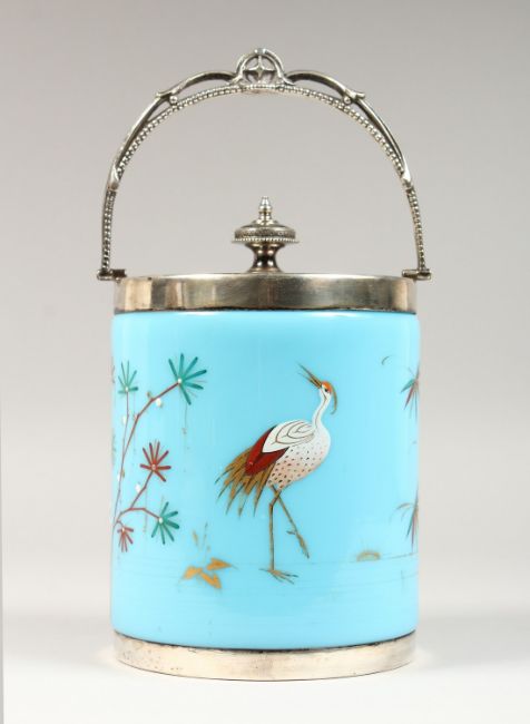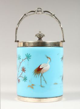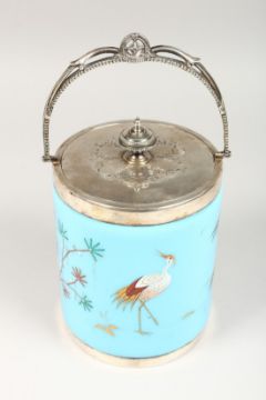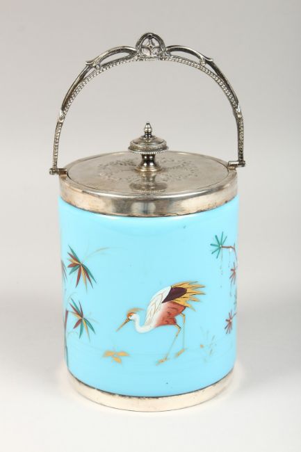A VICTORIAN BLUE GLASS CIRCULAR OPALINE BISCUIT BARREL painted with birds and bamboo with plated handles.