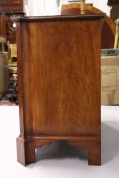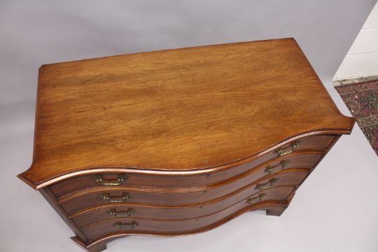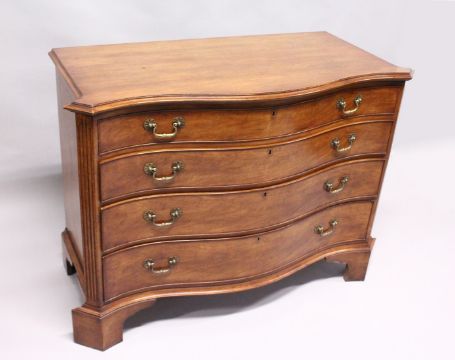 A GEORGE III DESIGN SERPENTINE FRONTED MAHOGANY COMMODE with four graduated long drawers, fluted columns on bracket feet.