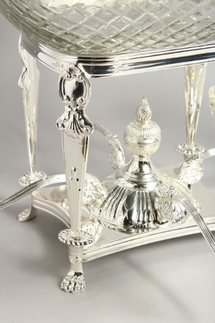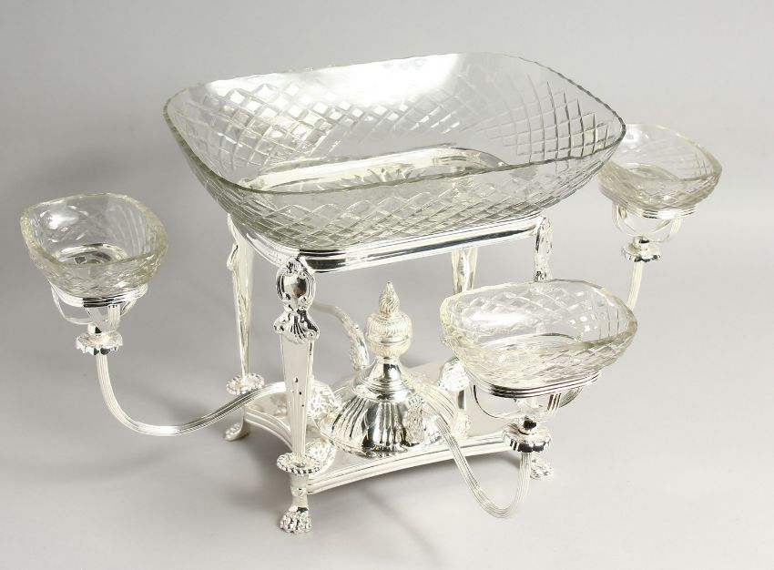 A VERY GOOD LARGE PLATED CENTREPIECE with cut glass dish and four arms each with a small cut glass dish.